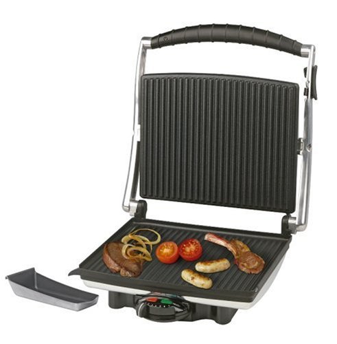 Plaques en fonte pour un transfert de température optimalRevêtement anti-adhérantCharnière flottante avec presse en fonte d'aluminiumThermostat réglable de 130-230°CBac à graissesEnsemble en fonte d'aluminiumPuissance: 1800WDimensions: 15 x 39,5 x 38,5 cmPoids: 5,25kg